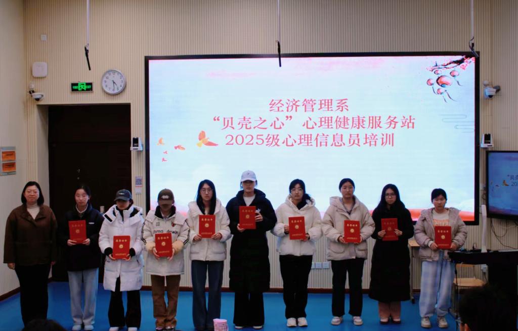 为加强学生心理健康工作队伍建设,提升心理信息员的专业能力,经济管理系“贝壳之心”心理健康服务站开展新学期心理信息员专题培训,2025级心理信息员参加了本次培训。
