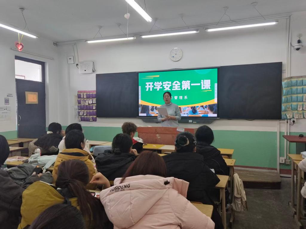 本次活动中,系党总支书记为全体学生会干部讲授专题课。课程以春节期间各地发生的一系列安全事故作为警示案例,明确全体干部要夯实安全防线,共建平安和谐校园;号召学生干部率先关注心理健康,培育积极阳光心态;要求学生会成员科学制定新学期学习目标,合理规划新学期生活,把重心转移到学习上来。辅导员们分别开展主题班会,精心讲好新学期“第一堂安全课”。通过案例分析、情境模拟、警示片观看等形式,向学生普及消防安全、交通安全、心理健康及食品安全知识,引导大家掌握逃生自救技能,识别诈骗套路,切实提升安全防范意识与自我保护能力。经管系同步组织了教职工安全教育会议,压实岗位安全责任,形成“师生共学、全员参与”的良好氛围。