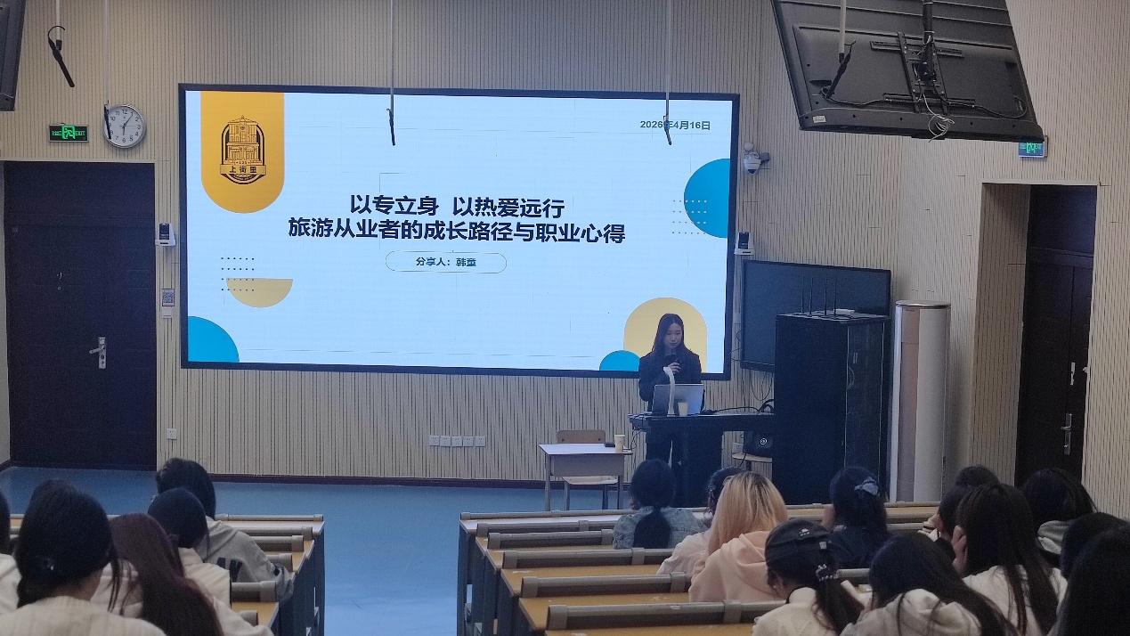 分享会以“以专立身,以热爱远行——旅游从业者的成长路径与职业心得”为主题,分享了一线旅游行业的发展趋势,用真实案例讲解了专业能力、服务意识等核心素养的重要性,为同学们的旅游职业规划提供了实用建议。随后,韩童又围绕导游专业核心能力培养,结合实际案例为同学们详细讲解了导游词创作、景点讲解及应急处置技巧等内容,为同学们在今年的导游省赛国赛中取得优异成绩打下了良好基础。